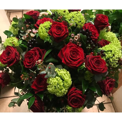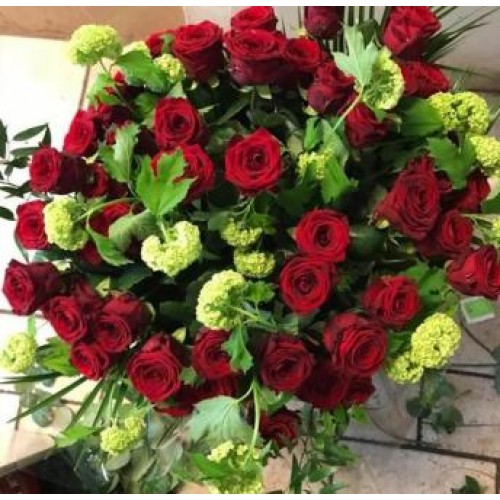 An exquisite hand tied bouquet of 12, 24 or 48 Naomi red roses with Viburnum and Wax Flower.