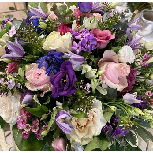 An Exuberant bouquet of Roses, Lisianthus, Clematis much more.