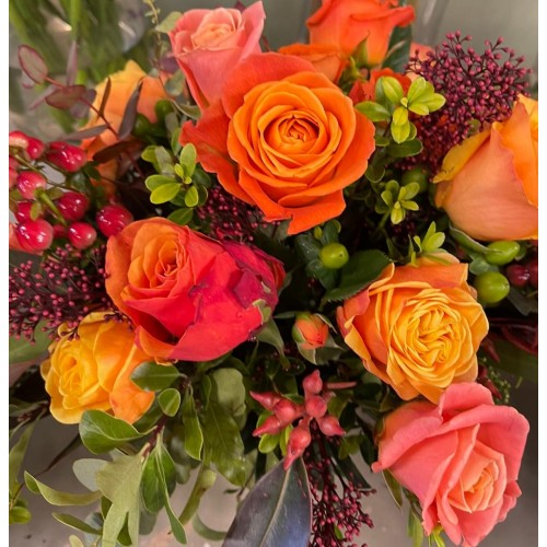 A Radiant Bouquet of Hypericum, Berries, Roses and Foliage.